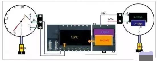 有了这样的信号就实现把就地的压力信号,远传到远处的电气控制柜去参与自动远程控制了,其中C和B是一个开关量,C和A也是一个开关量。