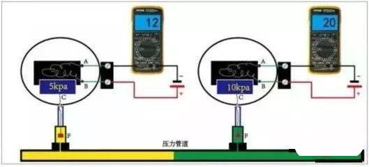 我们管道上安装一块量程为0-10kpa的压力变送器,电源正极接压力变送器的B点,负极串联一块万用表到压力变送器的A点,并将万用表打到电流档。当压力变送器C点的压力是5kpa时,万用表的的电流读数是12mA。正好是4-20mA的电流信号的中间值,而5kpa也正好是0-10kpa压力值的中间值。当压力变送器C点的压力是10kpa时,万用表的的电流读数正好是20mA。